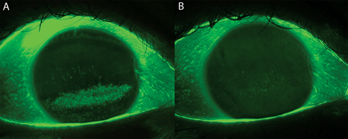 At her scleral lens follow-up, she reported discovering that she did, in fact, sleep with her eyes slightly open. Her vision and corneal topography normalized within 3 months, and her quality of life greatly improved. Combined therapy with scleral lenses and nighttime lubrication allowed her to sleep regularly for the first time in years. The patient was extremely pleased to find the “cure” for her insomnia.